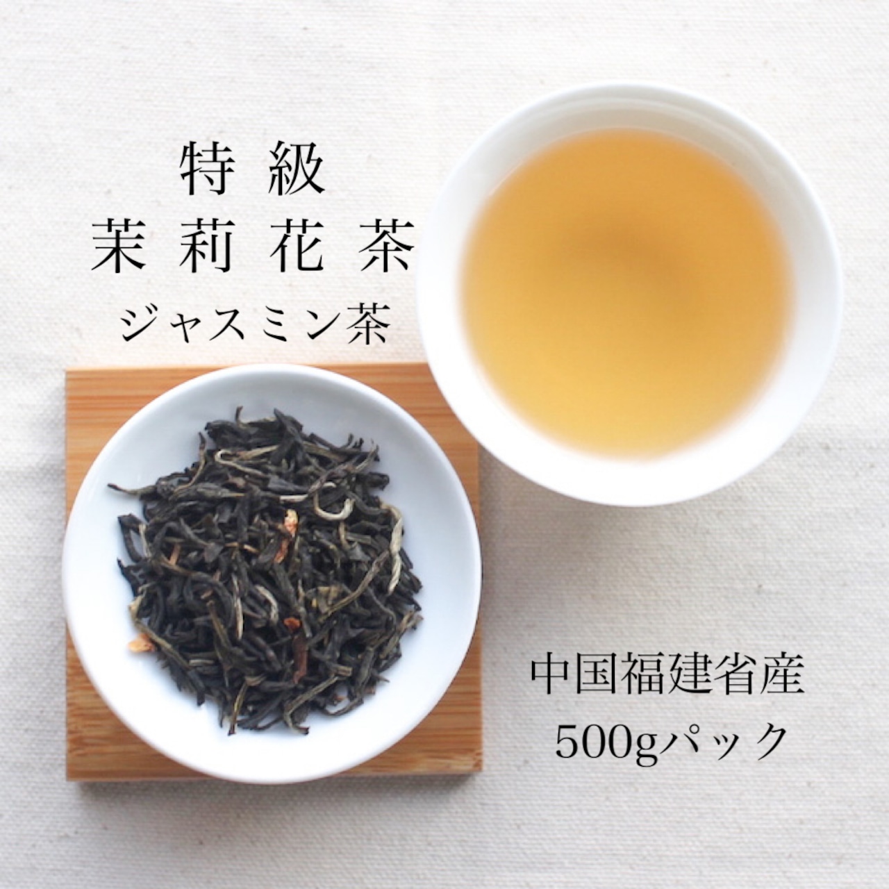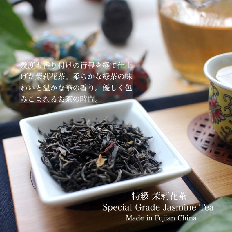 丁寧にジャスミンの香りを移した柔らかな茶葉。花びらの量が少ないのが特徴的な「特級 茉莉花茶」。ふわりと上品に広がるジャスミンの香り、柔らかな緑茶の味わいがお楽しみいただけます。